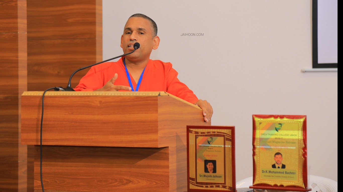 Summary of Mujeeb Jaihoon’s thematic presentation at EMEA Training College (Kondotty- Kerala). Co-guests at the event included Dr.k Mohammed Basheer, Vice Chancellor of Calicut University, Swami Athmadas Yami Dharmapaksha, counselor and trainer, Aseel Abdul Wahid, principal of the college (july 05 2018).
