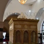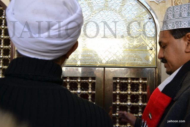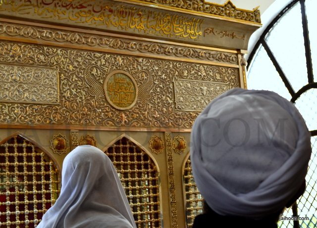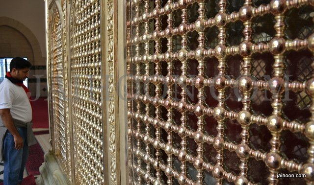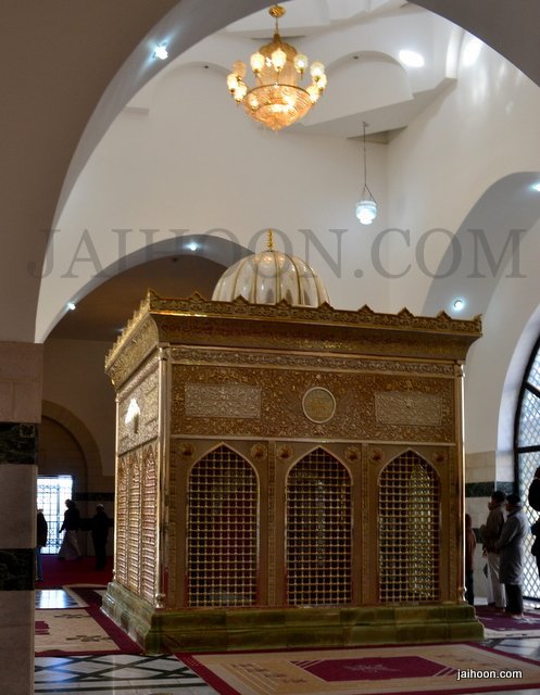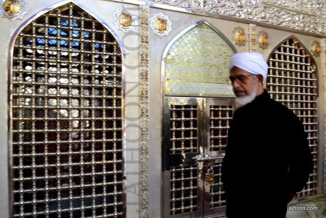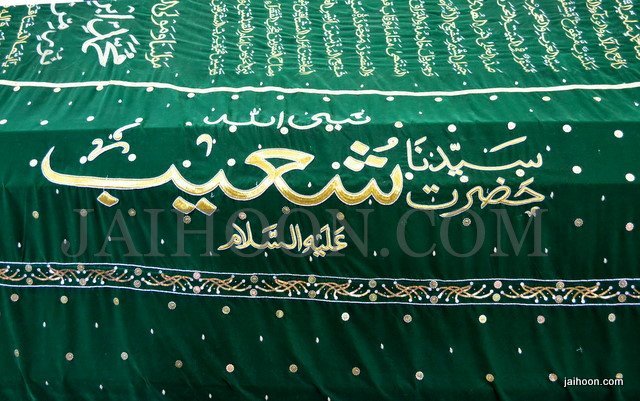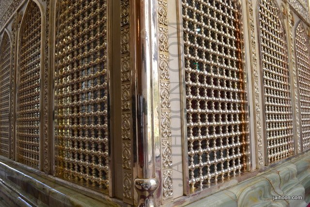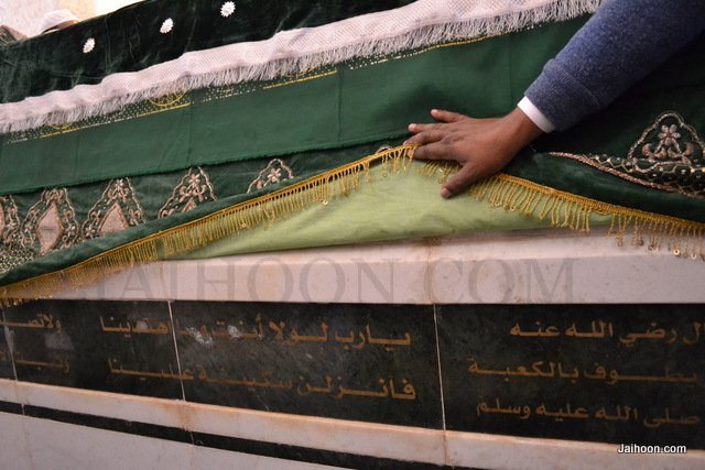 At the mausoleum of Jafir bin Abi Talib. The green stone used here was brought from India. The building was patronized by Sayyid Burhanuddin, the Bohra community leader.