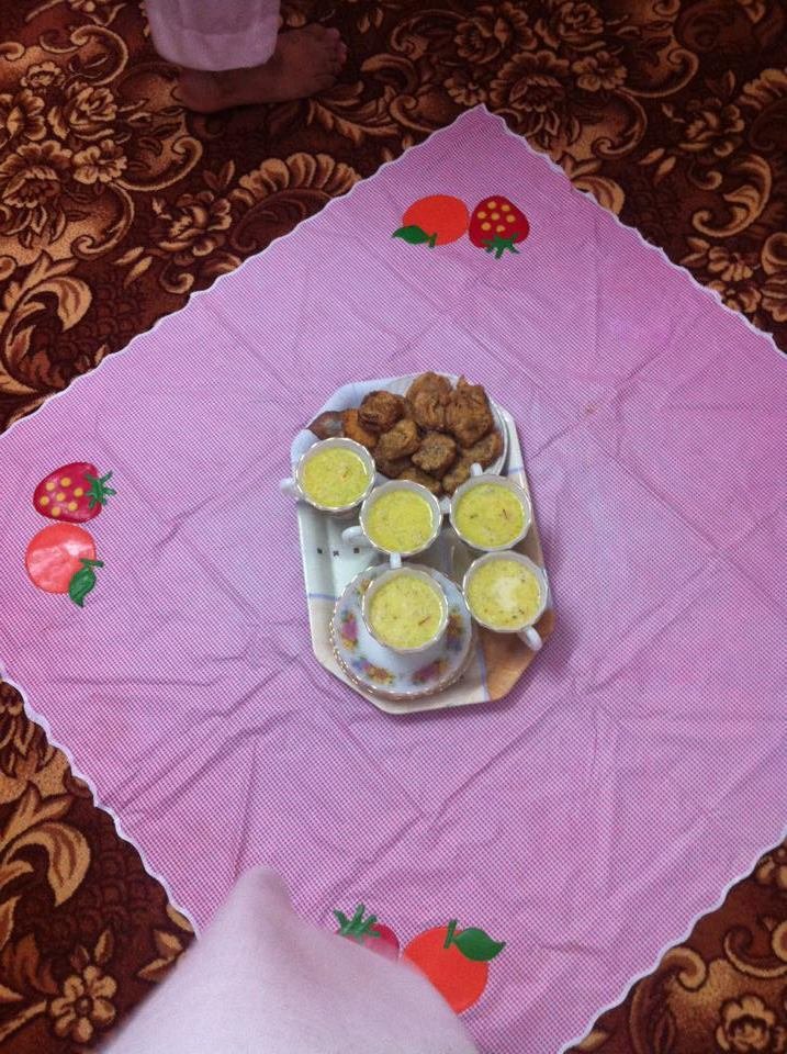 Members sit on the carpeted floor in a circle in the posture of sitting for prayer. A plastic sheet is first laid upon which a carrier stand is put. A huge plate is put and sweet is first served. Before eating from the lump of sweet, one member extends a small packet of salt for each member to take a pinch. The salt-pinch is said to ward off at least 72 sicknesses. After eating the salt and sweet dish, mutton curry is put in a vessel at the center. The bread is broken by the member and each piece is given to others. Nevertheless, the idea is to share the food from the same vessel and avoid any wastage of food.