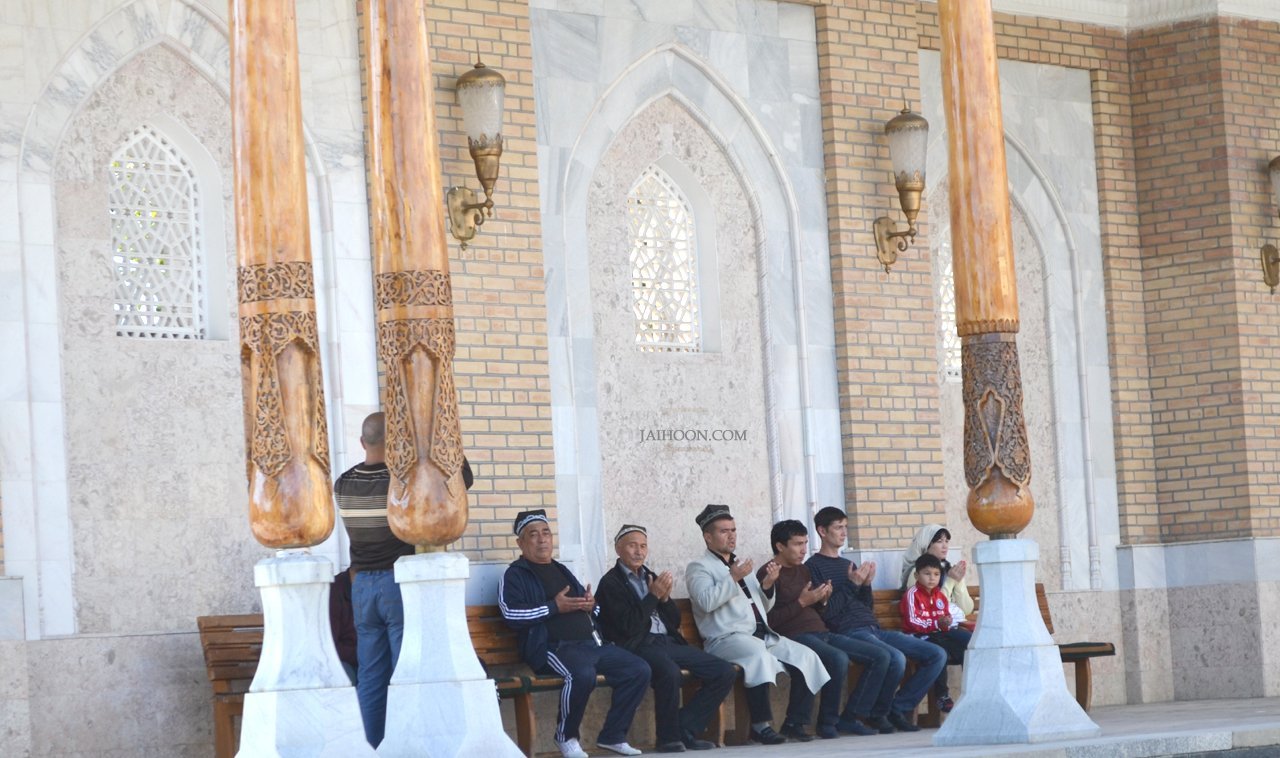 Inside the mosque, the Imam delivered the sermon in Uzbek first, then in Arabic. The latter seemed to be less fluent than expected. With a mini dome-sized white headgear, he was completely dressed in white spotting zero beard on his face. After the prayer, he conversed little in Arabic. Men in black suits adorned in tubeteika , the typical squared Uzbek cap, escorted him while he was returning to his room.