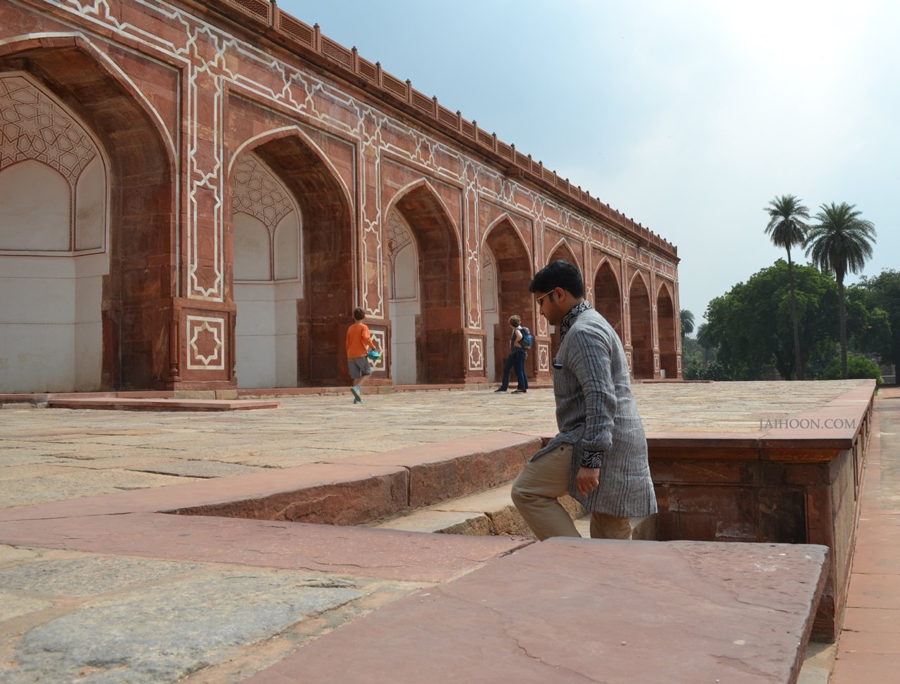 A little girl played on the rails of the garden in the courtyard. The innocence on her face would baffle even the angels around this vicinity. The arches reflected well in the green pond in the left corner.